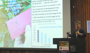 Se presentaron tres conferencias, “Nutrición convencional y orgánica en huertos de arándanos en Oregon” y “Manejos de poda para huertos jóvenes y adultos de arándanos” dictada por la profesora Bernardine Strik, y el panel titulado “Manejos de poda para huertos jóvenes y adultos de arándanos” dictada por la profesora Pilar Bañados. En cuanto a los paneles se presentaron tres temas “Nuevas plagas amenazan la producción de berries en Chile. Estrategias de control” que contó con exposiciones de los profesores Bernadine Strik y Luis Sazo, el segundo tema presentado se tituló “El futuro de los berries: avances y desafíos en la investigación” con participación de los profesores Pilar Bañados, Marina Gambardella y Bruno Mezzetti y por último, el panel “La producción de frutilla en el mundo” con exposiciones de los profesores Daniel Kirschbaum y Bruno Mezzetti.