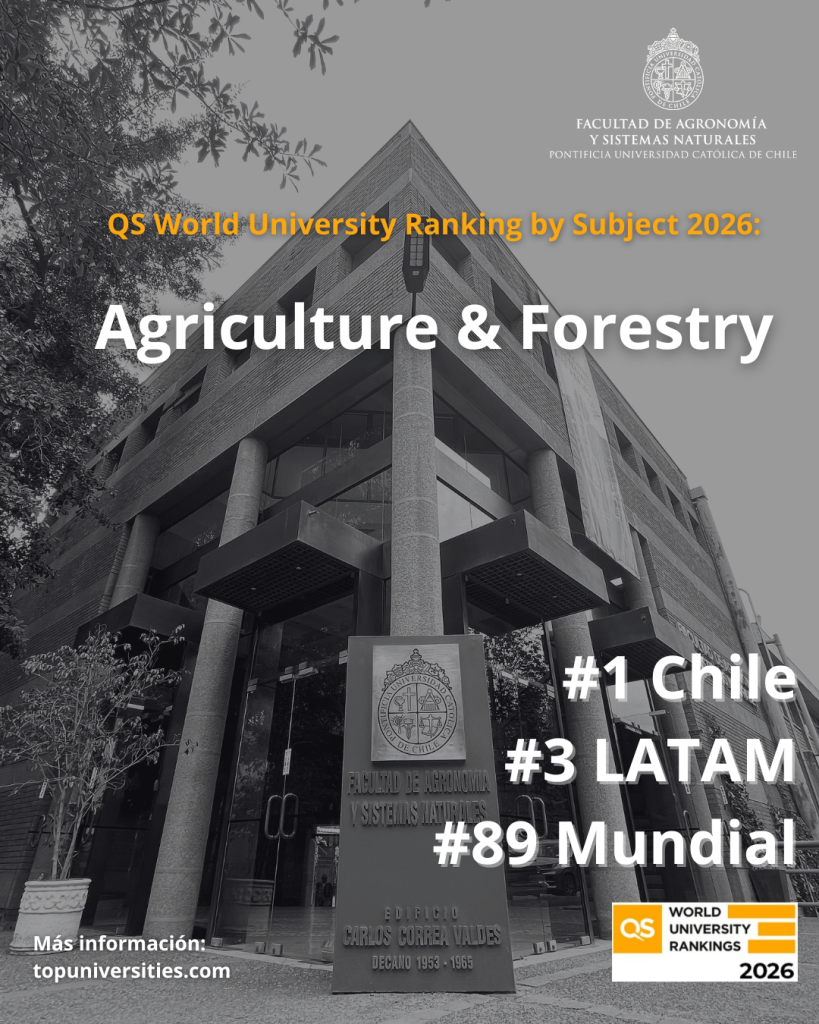 La Facultad de Agronomía y Sistemas Naturales de la Pontificia Universidad Católica de Chile fue posicionada como N°1 de Chile, N°3 de Latinoamérica y N°89 del mundo en las áreas de Agricultura y Forestal, según la edición 2026 del QS World University Rankings by Subject, una de las clasificaciones internacionales más reconocidas en educación superior.