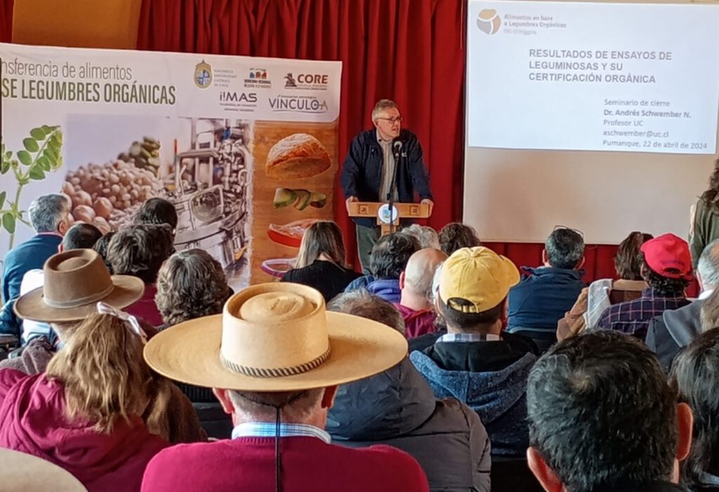 El profesor de la Facultad de Agronomía y Sistemas Naturales UC, Andrés Schwember, presentó los resultados de su investigación titulada “Transferencia alimentos orgánicos base legumbres”, la cual -por primera vez en Chile- entregará certificación orgánica en legumbres e incorporará tecnologías innovadoras para la producción de legumbres producidas por pequeños productores, mediante manejos de producción para el cultivo de lentejas y garbanzos.