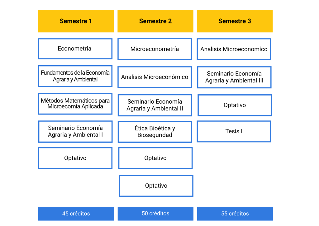 El Magister en Economía Agraria y Ambiental es un programa científico, con un Plan de estudios de 150 créditos que se desglosan en 80 créditos de cursos mínimos u obligatorios, 40 créditos de cursos optativos y 30 créditos de la Tesis. La Tesis tiene el objetivo de formular una hipótesis científica, definir objetivos y realizar actividades experimentales que permitan resolver un problema científico o tecnológico propuesto en el ámbito de las ciencias vegetales.